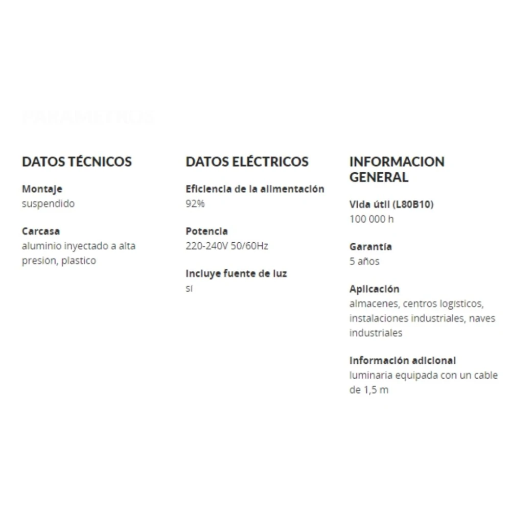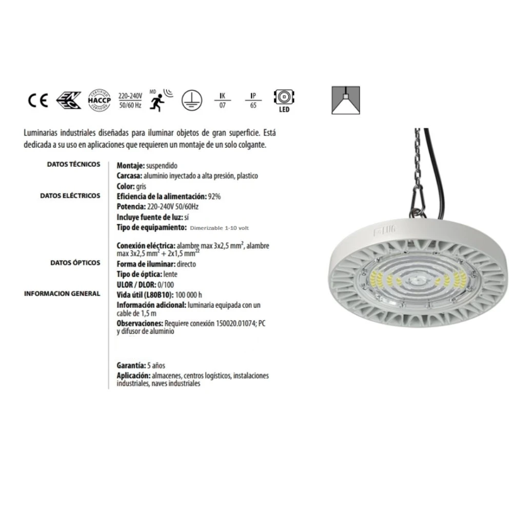 - Iluminación industrial de alto rendimiento: entrega 20.400 lúmenes con apertura amplia de 120°, logrando cobertura uniforme en naves, depósitos y espacios de gran altura.
